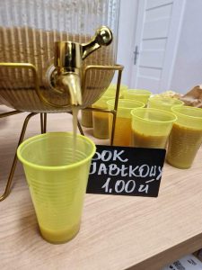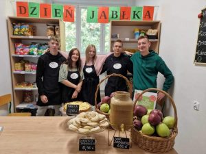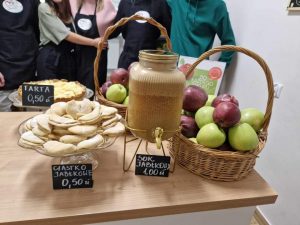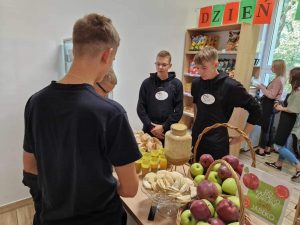 Ucztowaliśmy przy tarcie jabłkowej, waniliowych ciasteczkach z jabłkiem, świeżo wyciskanym soku jabłkowym. Wszystko przygotowali dla nas uczniowie z technikum żywienia i usług gastronomicznych pod opieką p. Natialii Topólniak.