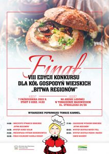 Pragniemy poinformować, że w najbliższą sobotę, tj. 7 października br. o godz. 14:00 na terenie Areny Lodowej w Tomaszowie Mazowieckim odbędzie się Ogólnopolski Finał VIII edycji Konkursu Kulinarnego dla Kół Gospodyń Wiejskich „Bitwa Regionów” organizowany przez Ministerstwo Rolnictwa i Rozwoju Wsi oraz Krajowy Ośrodek Wsparcia Rolnictwa przy współpracy z instytucjami podległymi i nadzorowanymi.