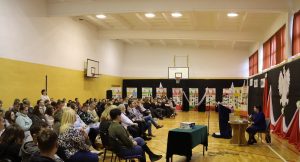 Zaproszeni goście, młodzież, nauczyciele i pracownicy szkoły mogli wysłuchać wykładu na temat wystawy „ZNANI NIEZNANI. POLACY ŚWIATU”.